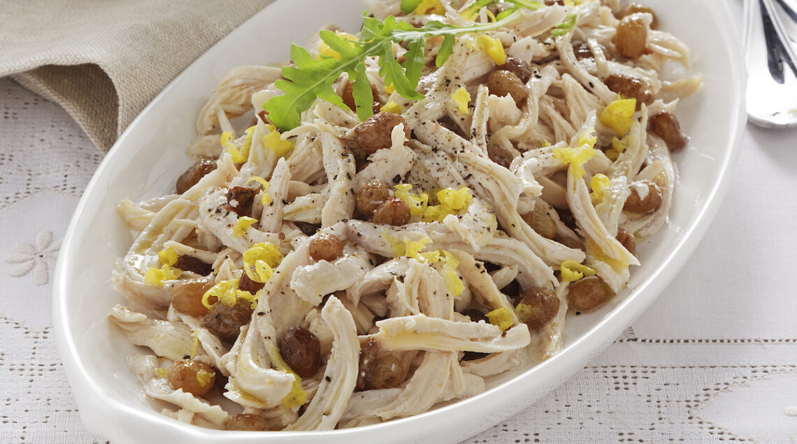 Oltre a mele e noci, si può aggiungere alla pietanza altra frutta fresca (acini d’uva, avocado, ananas, pesche) oppure secca (nocciole, pinoli, mandorle, uvetta). Proprio l’uvetta rientra nell’insalata di pollo “alla Gonzaga”, tipica mantovana (foto in alto). Per prepararla, per 4 persone, lessate per 20 minuti a fuoco dolce, in acqua salata, 600 g di petto di pollo con una costa di sedano e una carota. Lasciate raffreddare la carne nel liquido di cottura. Mescolate in una ciotolina mezzo bicchiere scarso di vino bianco con un cucchiaio di acqua tiepida e un cucchiaino di zucchero, unite 50 g di uvetta e lasciatela rinvenire. Scolate il pollo, sfilacciate la carne e trasferitela in una terrina. Emulsionate 3 cucchiai di olio con 3 di aceto. Unite la scorza di mezzo limone grattugiata, l’uvetta con il liquido, sale e pepe. Versate sul pollo, mescolate e fate insaporire per alcune ore (anche per un giorno intero) prima di servire.