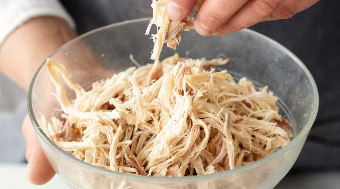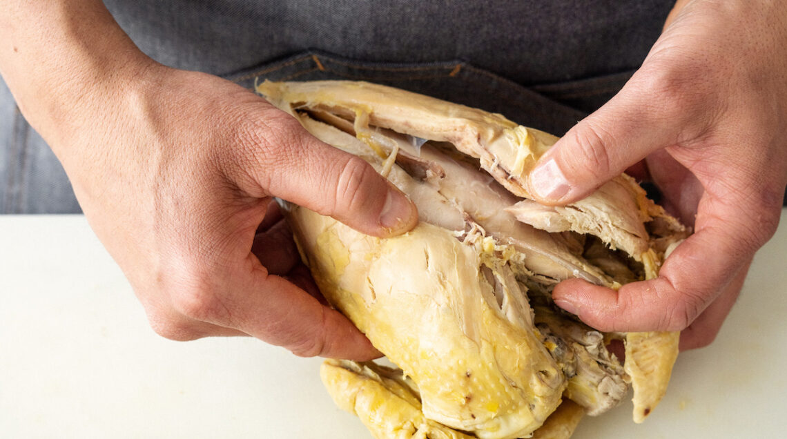 Cotto e raffreddato, il pollo intero o a pezzi deve essere privato della pelle, sebbene quella più sottile e rosolata del pollo allo spiedo può essere in parte conservata. Poi, si spolpa la carne (foto in alto), staccandola dagli ossi. Il petto si può affettare, tagliando contro fibra per ottenere lamelle sottili: usate una lama ben affilata per evitare di sbriciolare la polpa.
