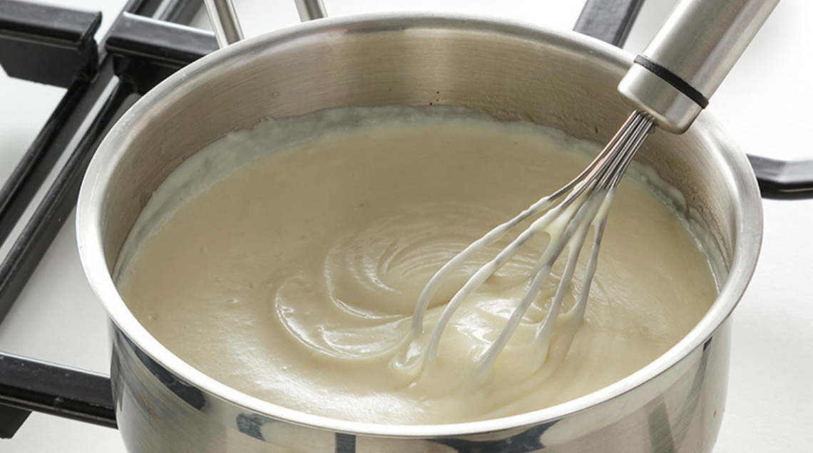 Dopo il condimento, è importante curare l’ultimo passaggio: l’aggiunta di un liquido che possa bagnare la pasta (una sorta di lessatura) e portarla a cottura. Sugo di pomodoro, panna fresca, latte (di vacca o vegetale), pesto, besciamella (foto sopra) devono essere molto fluidi, eventualmente allungateli con un po’ di acqua. Perfetto l’uso del brodo (anche di dado) di carne, vegetale, di miso, di pesce (il fumetto). Se necessario, potete rabboccare durante la cottura, aggiungendo altro liquido pochi cucchiai alla volta.