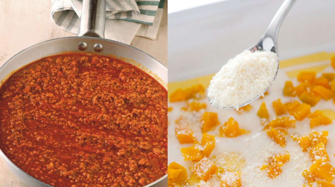 Le proposte sono quelle delle tradizionali ricette cotte in forno: in rosso, come ragù di carne (foto sopra a sinistra), sugo di pomodoro, sugo di pesce o sugo di verdure a base di pomodoro fresco, passata di pomodoro o pomodori pelati. Ottime anche in bianco con verdure a fette o a tocchetti (foto sopra a destra), pesce, carne a piccoli pezzi, salsiccia, salumi e formaggi a fette piuttosto spesse. Nella cottura in padelle non è possibile sfruttare le alte temperature che garantisce il forno e che tendono ad asciugare, e quindi a rassodare, gli ingredienti; al contrario, proprio perché il calore è più moderato, il condimento non deve essere troppo morbido, troppo piccolo (dadolata di verdure simile al soffritto per esempio) o troppo fine (verdure o salumi tagliati a julienne o a velo), pena il rischio che “si sciolga” diventando una poltiglia, sicuramente buona ma non altrettanto allettante per vista e palato. Per la stessa ragione assicuratevi che nel ripieno dei cannelloni ci sia sempre un addensante, per esempio un ingrediente ricco di amido, come le patate; oppure potete aggiungere al composto un po’ di fecola, amido (di mais o di riso) o farina di grano, di riso, di ceci, di castagne.