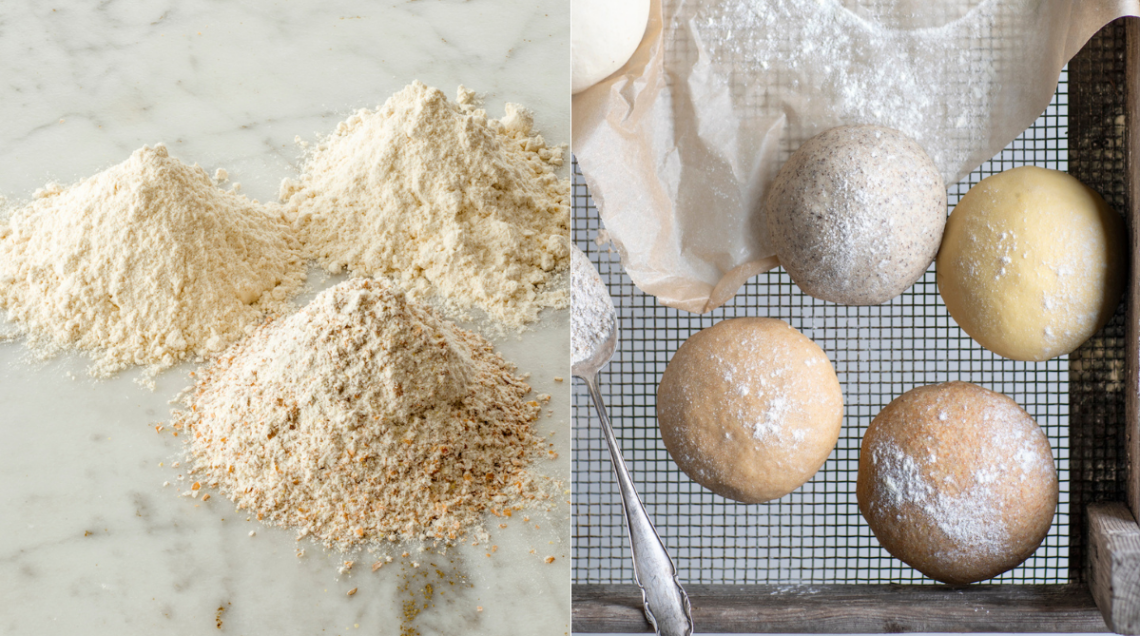 La farina (foto sopra a sinistra) più comune è quella bianca, una farina altamente panificabile che contiene l’agente segreto, il glutine, un complesso di sostanze proteiche che, imprigionando i gas della fermentazione, dà forza ed elasticità all’impasto, regalando pane ben lievitato e soffice mollica. Come vi raccontiamo qui, la farina di grano tenero, ricca di amido, ma povera di fibre e proteine, è disponibile in varietà più o meno raffinate: farina 0, farina 00, tipo 1, tipo 2, integrale e Manitoba, una farina quest’ultima forte, cioè con un alto tasso di glutine, e per questo spesso mescolata con farine deboli. Da una seconda macinazione della farina di grano tenero, nasce la “rimacinata”, farina di grano duro, ricca di proteine e quindi di glutine. Un tipo di farina di grano duro è anche il kamut. Tra le farine alternative, quella di segale, farro e avena non amano stare da sole perché incapaci di lievitare a dovere e quindi devono necessariamente miscelarsi con farina di grano tenero. Farina di riso, grano saraceno, mais e teff aprono il mondo della panificazione ai palati “gluten free”, tra i più penalizzati in fatto di lievitati. Un rinforzo serve anche alle farine di legumi (ceci, piselli, lupini, lenticchie), di castagne, di canapa e di amaranto che regalano impasti interessanti (foto sopra a destra).