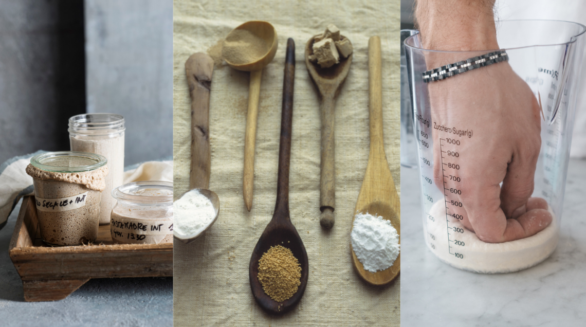 Il più naturale è il lievito madre, o pasta madre o pasta acida (foto sopra a sinistra), si ottiene mescolando acqua e farina e lasciando fermentare il miscuglio all’aria in modo che i microorganismi presenti nella farina e nell’acqua si attivino a contatto con l’aria dando il via alla fermentazione. Questo tipo di lievito, che va rinfrescato periodicamente, è disponibile solido o liquido, il li.co.li (lievito in coltura liquida). Il lievito madre dà un risultato più fragrante, digeribile e più duraturo, rispetto alla preparazione con il lievito di birra. Qui vi raccontiamo come prepararlo in casa. Diversa è la biga, (foto sopra al centro) un pre-impasto, che prevede l’aggiunta di un pizzico di lievito di birra fresco e sale per produrre acido lattico e avviare la fermentazione. Una volta che la biga è pronta si aggiunge altra farina e acqua in quantità utile a raggiungere la dose di impasto desiderata. L’utilizzo della biga regala lievitati più digeribili, profumati e fragranti e dal colore più intenso. Il lievito più veloce, ma anche il più contestato, è il lievito di birra (foto sopra a destra), un lievito economico e veloce che però penalizza il risultato finale della panificazione; usando il lievito di birra infatti l’impasto pur gonfiandosi rapidamente, una volta cotto, altrettanto rapidamente tende a diventare secco. Esiste anche il pane senza lievito, è il pane azzimo, di tradizione ebraica.