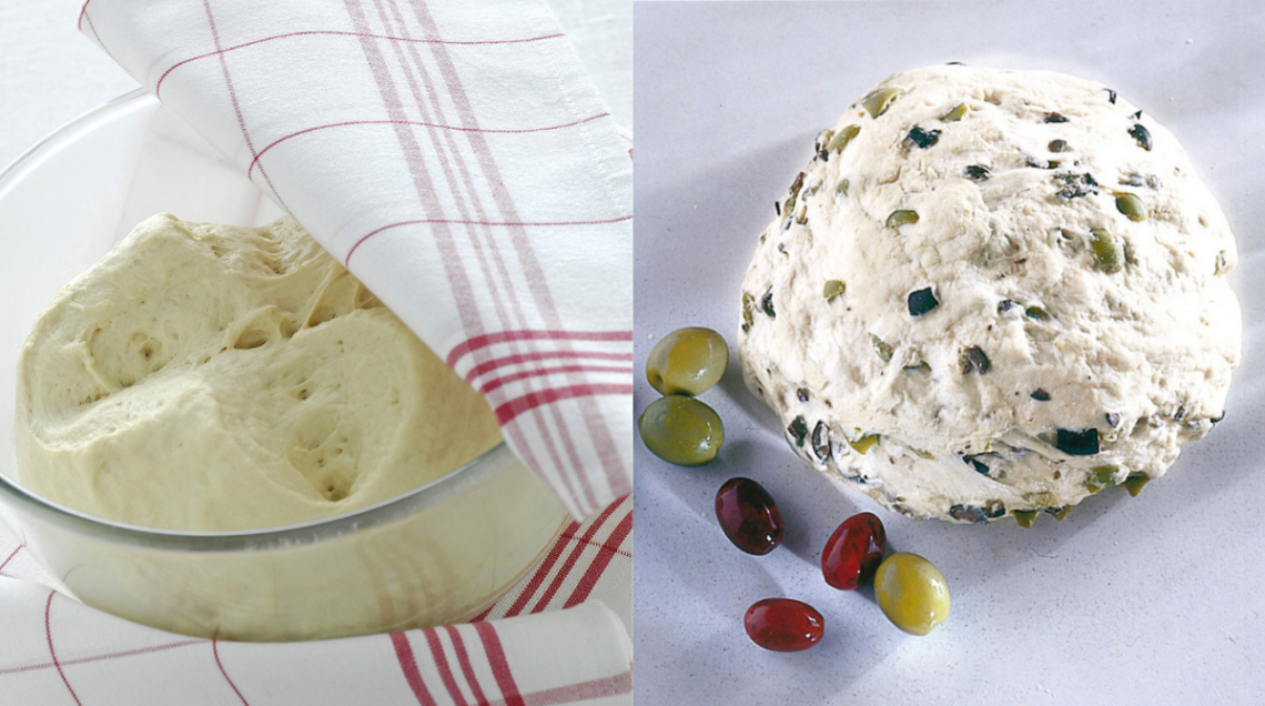 Sciogliete 25 g di lievito di birra fresco in una ciotola con 100 ml di acqua minerale naturale tiepida, 1 cucchiaio scarso di zucchero (utile per attivare il lievito), 3 cucchiai di farina 0 e 2 cucchiai di farina manitoba o di farina di grano duro. Mescolate bene, formando un panetto morbido e lasciatelo lievitare coperto con pellicola per 2 ore. Versate 300 g di farina 0 e 200 g di farina manitoba a fontana sulla spianatoia, fate un incavo al centro, spolverizzate i bordi con 2 cucchiaini di sale, iniziate ad impastare, mettete nell'incavo 150 ml di acqua minerale naturale, il panetto lievitato e lavorate per almeno 10 minuti, incorporando man mano la farina dai bordi e sollevando la pasta e ripiegandola verso il centro. Schiacciate più volte l'impasto con il palmo della mano e battetelo sul piano di lavoro, per rendere la pasta più elastica e resistente. Formate una palla, mettetela in una ciotola unta di olio, praticate un taglio a croce sulla superficie, coprite con un telo e fatela lievitare in un luogo tiepido per almeno 2 ore, finché sarà raddoppiata di volume. Esiste anche il pane "condito": oltre all'acqua, la parte liquida è composta da un'aggiunta di materia grassa, che può essere olio, burro, strutto, latte, yogurt. All’impasto base (foto sopra a sinistra) è possibile aggiungere olive (foto sopra a destra), miele, frutta secca e semi, zafferano, purea di verdure, erbe aromatiche, spezie. Se invece usate la pasta madre, aggiungete farina e, a piacere, malto o miele per dare alla crosta un colore dorato.