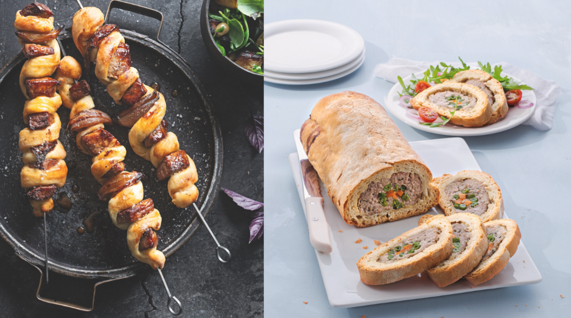 La pasta da pane si presta a molte interpretazioni, come cornetti, girelle, bicchierini ed empanadas farciti rispettivamente con salumi, pâté di olive, verdure, mozzarella e pomodoro, ideali per un buffet, una merenda o un brunch. Ancora un finger food, gli spiedini di pane e agnello (foto sopra a sinistra) con insalata di melanzane, da proporre anche come secondo, sono preparati con carne di agnello. Più adatto a un pranzo in famiglia il polpettone in crosta di pane, con carne di maiale, manzo e mortadella (foto sopra a destra).