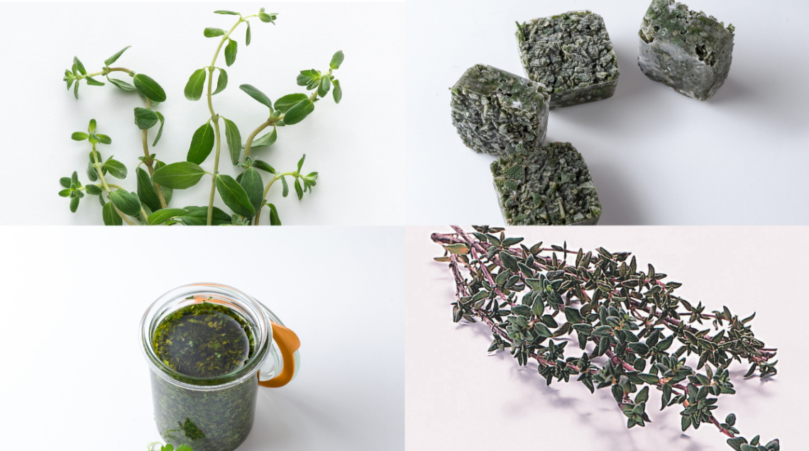 I mazzetti freschi appena raccolti (foto sopra nel riquadro a sinistra in alto), come tutte le erbe aromatiche, si conservano per alcuni giorni in un bicchiere pieno d’acqua o in frigorifero con i gambi avvolti in un pezzo di alluminio. Le foglie, come per esempio quelle del basilico, possono essere messe sott’olio (foto sopra nel riquadro a sinistra in basso) in piccoli vasetti ermetici; sciacquate e tritate possono essere surgelate (foto sopra nel riquadro a destra in alto), utilizzando le vaschette per il ghiaccio, per avere pratici cubetti monodose. Infine, possono i rametti possono essere essiccati (foto sopra nel riquadro a destra in basso) stendendoli all’aperto, ma non al sole diretto, in un essiccatoio o nel forno a bassa temperatura (circa 50°) finché le foglie cambiano colore. Come le altre “erbe robuste” (per esempio alloro, menta, origano, salvia e rosmarino) trattengono il loro caratteristico aroma anche seccate, anzi lo concentrano e per questo andrebbero usate in dosi ridotte rispetto a quelle fresche. Da ricordare che la raccolta primaverile è per il consumo fresco, quella a inizio autunno è invece destinata alla conservazione, in particolare l'essicazione.