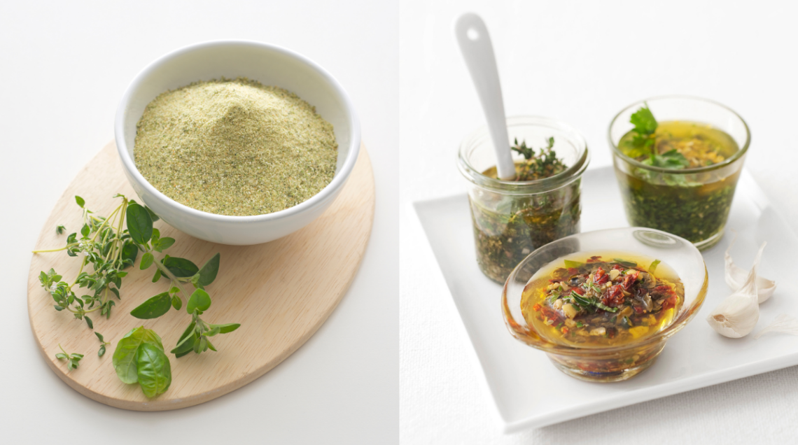 Prima di arrivare a raccontarvi come aggiungere la maggiorana in cottura, vi spieghiamo come usarla a crudo, in tante varianti veloci e saporite: le foglie fresche tritate più o meno finemente sono utili per profumare le briciole di pane e il pangrattato (foto sopra a sinistra) con cui fare ripieni, gratin e panature; aggiunte al sale (100 g di sale + le foglie di 10 rametti di maggiorana) insaporiscono carne, pizze, focacce e sughi, soprattutto quelli a base di pomodoro, e anche la crosta di sale, tecnica di cottura interessante anche per il benessere. Per la sua delicatezza, la maggiorana si mescola facilmente al burro, prima ammorbidito e poi riposto in frigorifero per riappropriarsi della forma solida, e al formaggio fresco, come per esempio ricotta, robiola, stracchino e crescenza, caprino. È perfetta anche per aromatizzare formaggi come la feta, fresco o grigliata, appena condita con un filo d’olio. Si lascia in infusione in olio e aceto e si aggiunge anche a diversi tipi di salse (foto sopra) che possono accompagnare il bollito, sostituire il soffritto o condire a crudo primi piatti (conchiglie con zucchine, maggiorana e mandorle), come pasta, riso o ravioli (mescolate olio, aglio, maggiorana, peperoncino, lasciate in infusione per un quarto d’ora). Indispensabile nel mix di “erbe di Provenza”, quest'erba entra spesso nel mazzetto aromatico per marinate e vinaigrette e -sorpresa- partecipa alla preparazione di liquori come il vermouth.