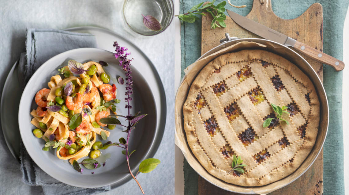 Particolarmente apprezzata nella cucina provenzale e nella cucina ligure, è immancabile nella cima alla genovese, nella torta pasqualina e nel minestrone ligure, la maggiorana è ottima per profumare zuppe e minestre, carni bianche, coniglio (come il coniglio in tegame con puntarelle e fave), frittate, carne e pesce alla griglia e in padella (raffinatissimo e sorprendente il controfiletto con salsa allo zola e maggiorana). Aggiunge note gentili anche alle insalate e sulle verdure a vapore, al forno (da provare il soufflé di gruyère e porri alla maggiorana, gli sformatini di patate con salsa e il flan di piselli, splendidi anche come antipasto) o in padella, nei ripieni (torta salata con pecorino e crostata con ricotta), sui primi piatti come negli scialatielli alla maggiorana con gamberi e fave (foto sopra a sinistra), dove è mescolata direttamente all’impasto, e nelle torte salate, come nella torta di porri alla maggiorana (foto sopra a destra). Le foglie fresche sono ottime anche per preparare il pesto, condimento gentile per pasta ripiena.