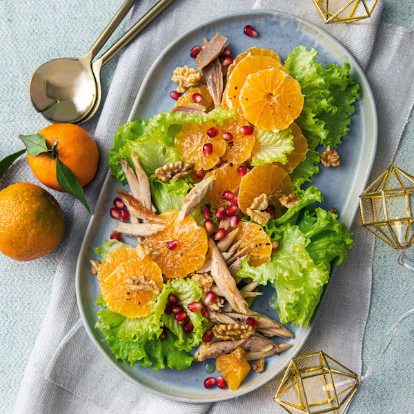 Insalata di faraona, clementine e melagrana. Tagliate una melagrana a metà e spremete il succo con uno spremiagrumi. Rosolate un chilo di faraona a pezzi in un tegame con un filo d’olio. Sfumate con il vino, sale, pepate e proseguite la cottura a pentola coperta per circa 35 minuti unendo il succo di melagrana ma mano che il fondo si asciuga. Spegnete, fate raffreddare, private la faraona della pelle e sfilacciate la polpa. Sbucciate 4 clementine e tagliatele a fette. Disponete in un piatto da portata 160 g di insalatina, le fette di clementine e la polpa di faraona. Sgranate un’altra mezza melagrana e cospargete i chicchi sull’insalata. Unite 40 g di gherigli di noci spezzettati e condite con olio, aceto balsamico, sale e pepe. Per 6 persone.