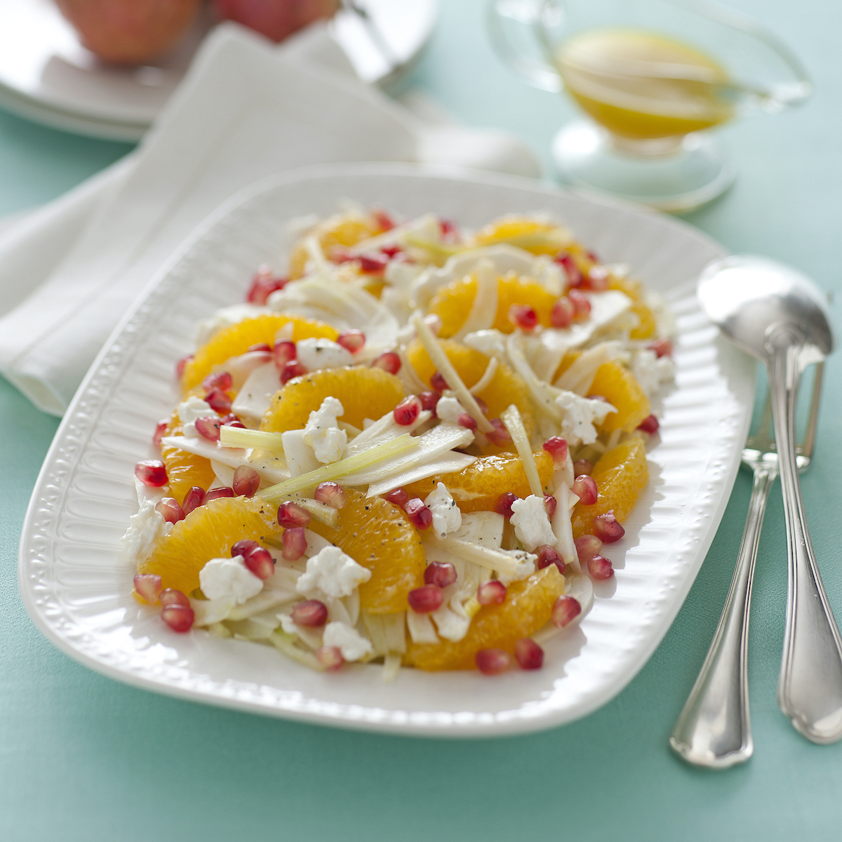 Finocchi, arance e melagrana. Sbucciate 3 arance e ricavate gli spicchi al vivo, raccogliendo tutto il succo. Pulite e tagliate a julienne 4 costole tenere di sedano bianco. Mondate e affettate sottilmente 2 finocchi. Emulsionate in una ciotolina un cucchiaio del succo delle arance con un cucchiaio di succo di limone, 3 cucchiai di olio, sale e pepe. Disponete in un piatto le verdure e gli spicchi di arancia e condite con la salsina preparata. Completate con 200 g di crescenza ridotta a fiocchetti, una manciata di gherigli di noce spezzettati e i chicchi di mezza melagrana. Per 4 persone.