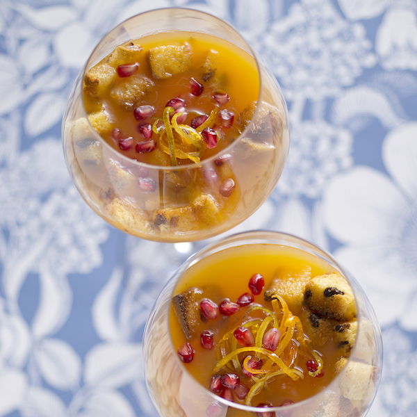 Panettone con agrumi e melagrana. Tagliate a julienne le scorze di un’arancia, un pompelmo rosa e un limone. Scottatele un minuto in acqua bollente e scolatele. Versate in una casseruola 100 g di zucchero e 1 dl d’acqua, portate a bollore, unite le scorzette e cuocetele 5-6 minuti finché lo sciroppo inizia ad addensarsi. Spegnete e fate raffreddare. Mescolate in una casseruola 4 dl di succo fresco di arancia, 3 dl di succo fresco di pompelmo rosa e 3 dl di succo di melagrana con 80 g di zucchero. Portate a ebollizione, fate ridurre il succo di un terzo, aggiungete 3 g di agar agar e proseguite la cottura 5 minuti. Lasciate raffreddare e unite 2 cucchiai di liquore all’arancia. Tagliate 200 g di panettone a dadi e tostateli sotto il grill del forno. Fateli raffreddare e suddivideteli in 8 coppe. Versatevi sopra la riduzione di agrumi e fate raffreddare in frigo per 3-4 ore. Guarnite con le scorzette candite e i chicchi di mezza melagrana. Per 8 persone.