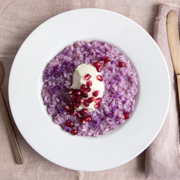Risotto al cavolo rosso, mela e melagrana. Mondate 300 g di cavolo rosso e tritatelo finemente nel mixer. Sbucciate e pulite una mela Golden, poi tagliatela a dadini. Sciogliete una noce di burro in una casseruola con 2 bacche di ginepro e la mela. Sfumate con mezzo bicchierino di Calvados, salate, pepate, coprite e cuocete 5-6 minuti. Scolate la mela e il ginepro dal fondo di cottura. Aggiungete un filo d’olio, una piccola cipolla tritata e fate stufare. Unite 320 g di riso Carnaroli, tostatelo, aggiungete il cavolo rosso (tranne un cucchiaio) e portate a cottura versando man mano circa un litro di brodo bollente. Frullate la mela e mescolatela in una ciotolina con 50 g di panna acida. Togliete il riso dal fuoco e mantecatelo con 40 g di grana grattugiato e una noce di burro. Servite con quenelle di mela, chicchi di melagrana (40 g in tutto) e il cavolo crudo tenuto da parte. Per 4 persone.