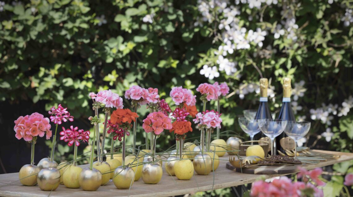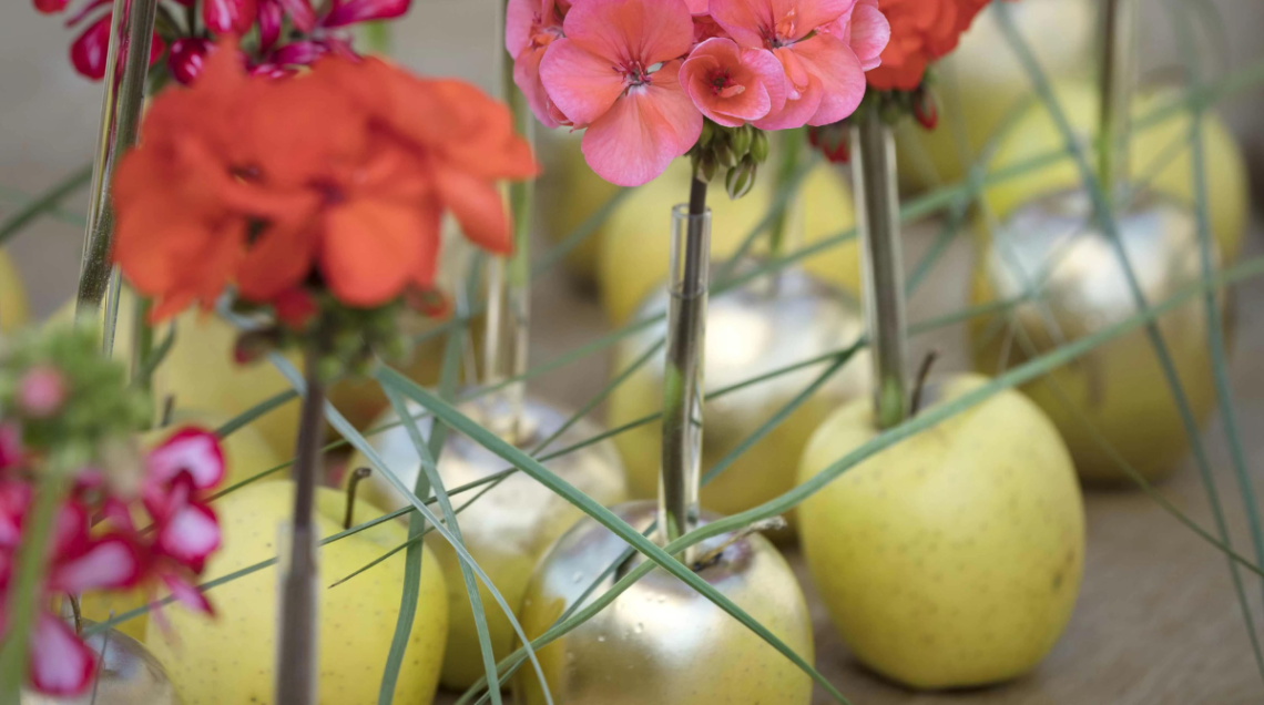 Basta qualche fiore di geranio reciso e altrettanti frutti da trasformare in vaso. Consigliamo le mele, più resistenti, ma non frenate la fantasia! Potete scegliere la versione monocromatica (tutti gerani rossi, o bianchi, gialli etc) o colorare la tavola con fiori di tinte tutte diverse. Ciò che dovete procurarvi sicuramente sono delle provette per l’acqua. Ideali sono quelle di vetro, ma vanno bene anche in plastica (e quelle le trovate da qualsiasi fioraio). Rimuovete i torsoli delle mele, usando uno speciale taglierino per la frutta. Inserite le provette di vetro in ogni mela e aggiungete acqua finché saranno piene a metà. Disponete i gerani recisi nelle provette, quindi distribuite le creazioni sulla tavola: qua e là, per un effetto più mosso, oppure ravvicinati in una striscia centrale per un effetto ancora più impattante. Se volete ‘esagerare’ con le decorazioni, potete dipingere le mele, per esempio con vernice spray dorata.