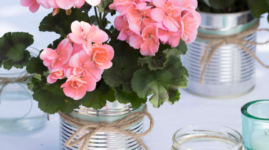 Questi comuni fiori anti-zanzare si trasformano in decorazioni festose per le nostre tavole estive. Semplicissime idee creative per addobbare coi gerani