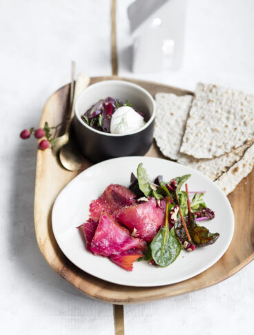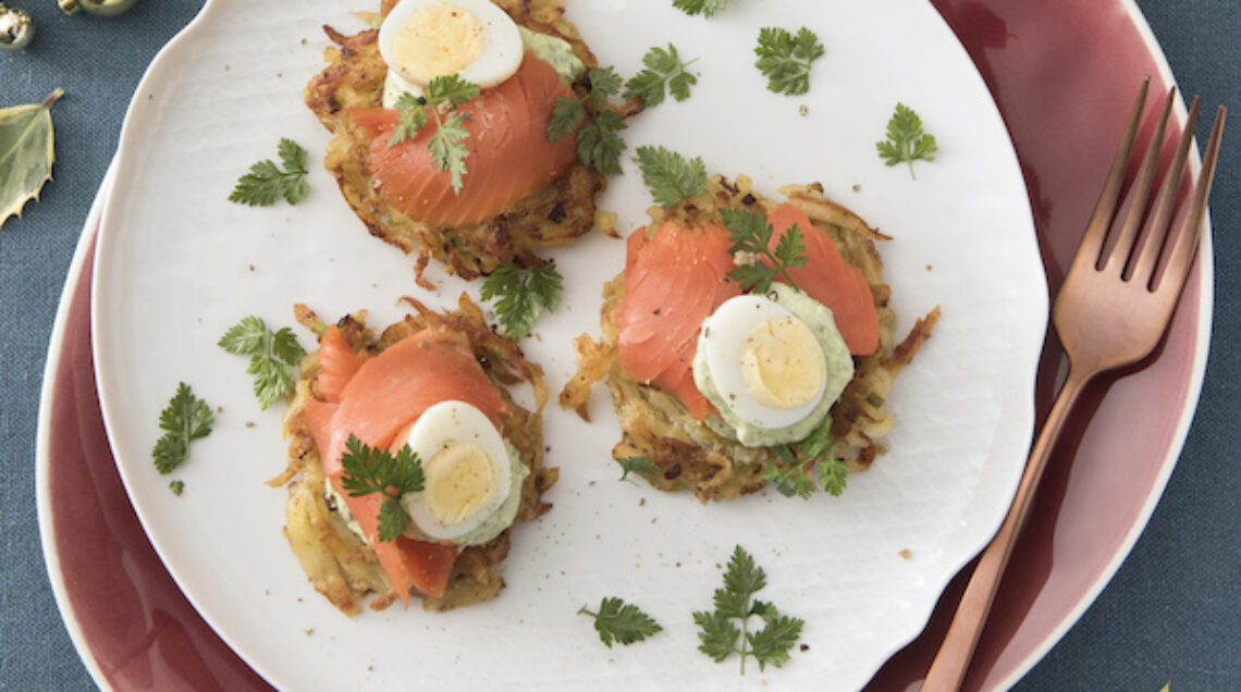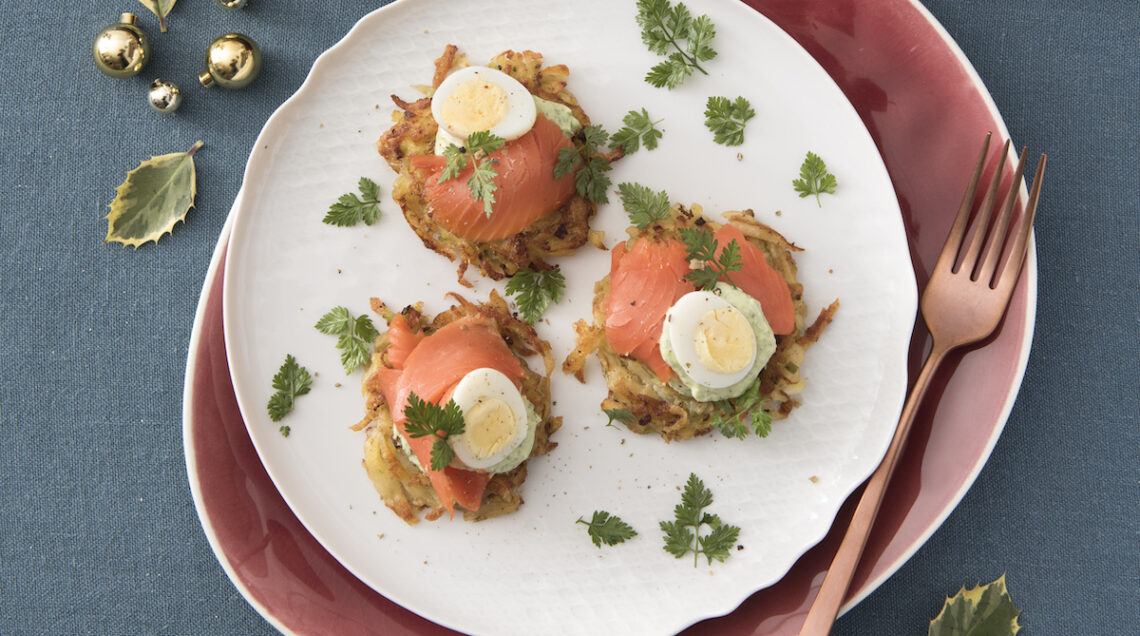 A completamento dei crostini o delle altre versioni creative, un tocco di colore è sempre gradito. Può essere, secondo tradizione, un ciuffetto di aneto, finocchietto, cerfoglio o una croccante fogliolina di prezzemolo riccio. Ma se volete che, al morso, i vostri ospiti sperimentino una piccola esplosione di gusto, date sfogo alla fantasia! Guarnite il salmone con rondelle finissime ricavate da un piccolo porro e capperini sott’aceto. O con le foglie e le infiorescenze più tenere di un cuore di cime di rapa: a crudo, si coglierà netto il sentore quasi senapato di questa verdura, che ben si accorda al pesce affumicato. Lo sanno gli svedesi che lo servono proprio con una salsa di senape. Con la stessa logica, potete aggiungere qualche pezzetto di mostarda di frutta, tritata fine fine. Molto natalizi e in perfetto accordo di gusto i frutti rossi, qualche chicco di ribes o un lampone, rifrescano e rendono l’insieme vivace. Si diceva, poi, dell’abbinamento con le uova. E allora, perché non decorare il vostro finger food affumicato con piccole uova di quaglia? È il suggerimento della ricetta dei latkes che vi lasciamo. E buon salmone sia!