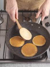 4) Cuocetele 3-5 minuti per lato a fuoco medio alto finché risulteranno ben dorate e croccanti. Sgocciolatele su carta da cucina e guarnitele con le fettine di salmone (200 g in tutto), un cucchiaino di crème fraîche, mezzo uovo di quaglia e foglioline di cerfoglio. Per 4 persone.