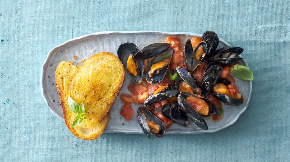 Cozze alla tarantina. Fate aprire in un tegame 2 kg di cozze con 1 spicchio d’aglio schiacciato e un mazzetto di gambi di prezzemolo. Intanto, private di semi e acqua 500 g di pomodori perini (a piacere, potete spellarli) e tagliateli a pezzetti. Tenete da parte le cozze e il loro liquido e rosolate nel tegame 2 spicchi d’aglio tritati con 1 peperoncino sbriciolato e 3-4 cucchiai di olio. Aggiungete i pomodori, bagnate con il liquido della cozze e cuocete qualche minuto. Riunite le cozze, mescolate e profumate con basilico spezzettato. Servite con crostini di pane o gallette (molto buono anche l’abbinamento con quadrotti di farinata). Per 6 persone.