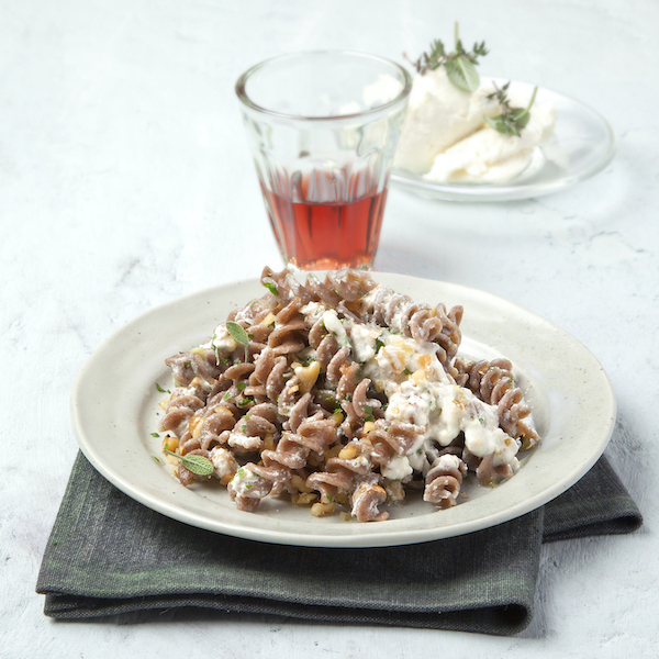 Fusilli alla ricotta. Lessate 320 g di fusilli di grano saraceno in abbondante acqua bollente salata. Nel frattempo, tritate nel mixer 50 g di gherigli di noce con mezzo spicchio d’aglio sbucciato, 2 foglie di salvia, qualche fogliolina di timo e un ciuffo di prezzemolo. Scaldate un filo d’olio in una padella antiaderente e fatevi rosolare il trito preparato per qualche minuto, mescolando. Aggiungete un mestolino d’acqua di cottura della pasta, 200 g di ricotta e amalgamate. Scolate i fusilli al dente, versateli nella padella, fateli insaporire qualche istante, pepate a piacere e servite. Per 4 persone.