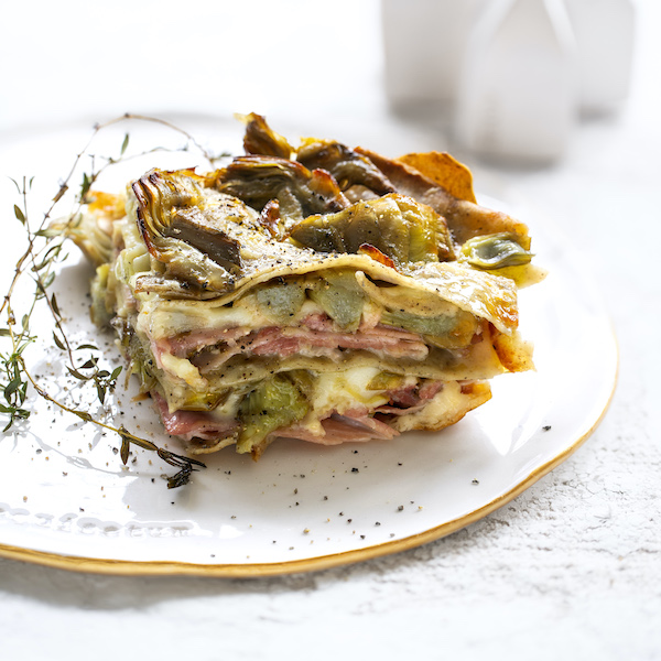 Lasagne con prosciutto, carciofi e taleggio. Mondate 4 carciofi e tagliateli a spicchi. Metteteli in un tegame un filo d’olio, 2-3 rametti di timo, uno spicchio d’aglio sbucciato, sale, pepe e ponete sul fuoco. Quando iniziano a sfrigolare, sfumate con un bicchiere di vino bianco, fate evaporare, versate un mestolo di brodo vegetale, coprite e stufate a fuoco basso 30 minuti. Intanto, lessate al dente, in acqua salata, 250 g di lasagne di grano saraceno e scolatele su un telo. Tagliate a dadini 250 g di taleggio. Disponete le lasagne a strati in una pirofila, unta d’olio, inframezzandole con prosciutto cotto (250 g in tutto), carciofi e taleggio, spolverizzando gli strati con poco grana padano grattugiato. Terminate con carciofi, taleggio, olio e pepe. Coprite con alluminio e infornate le lasagne a 200° per 20 minuti, togliendo l’alluminio a metà tempo. Per 4 persone.