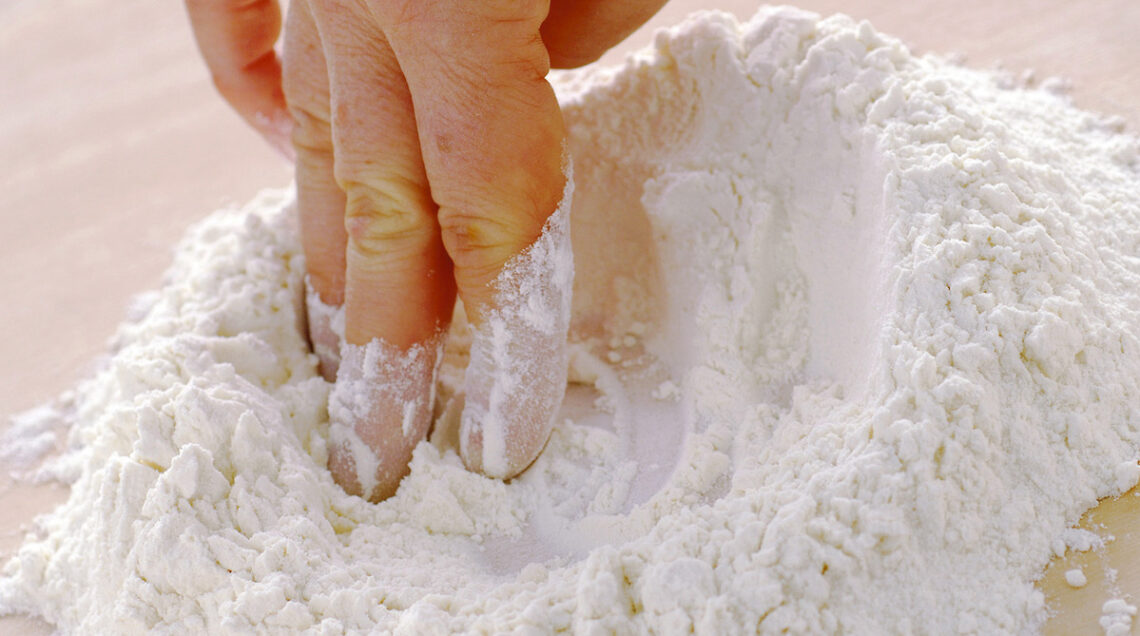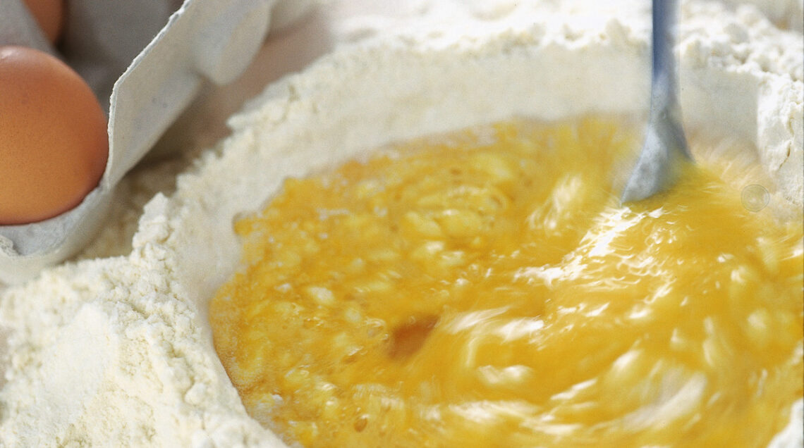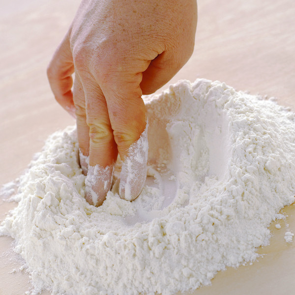 La prima operazione da fare è versare la farina sul piano e formare la cosiddetta fontana. Attenzione, non stiamo parlando di... un vulcano! Questo significa che non dovete fare un mucchio di farina conico, con un buchetto in mezzo, ma allargato e con una cavità centrale abbastanza ampia. Potete “aprirla” con le dita o darle forma con il fondo di una ciotola.