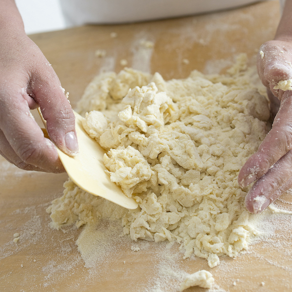 Quando la parte centrale inizia ad avere la consistenza di una pastella densa, lasciate da parte la forchetta e iniziate a usare le mani. Al contempo, radunate la farina esterna (e l’eventuale parte liquida comunque sfuggita) aiutandovi con un tarocco, la corta spatola in plastica che più avanti vi servirà anche per porzionare l’impasto. Lavorate energicamente, alternando le mani: agendo con la parte terminale del palmo (verso il polso) radunate, ripiegate e stendete più volte la pasta, per una decina di minuti, finché appare omogenea.