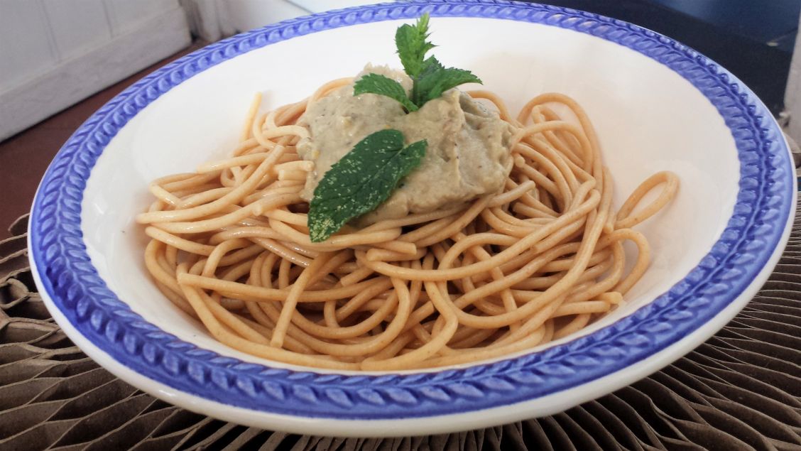 Arrostite la melanzana in forno. Una volta cotta, prendete la polpa e frullatela insieme a olio, sale e tahini. Condite la pasta con la crema ottenuta, i semi di cumino tostati, la menta e la mela tagliata a dadini molto piccoli.