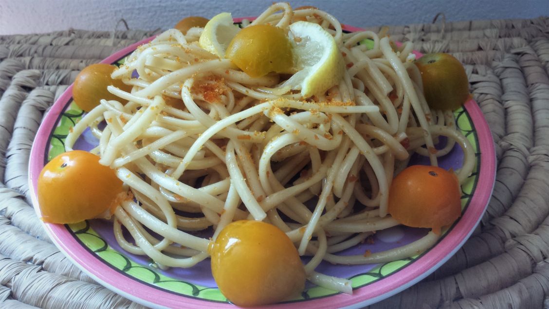 Cuocete la pasta molto, molto al dente, scolare e versatela in una ciotola con due o tre cucchiai di colatura e mescolare fino all’assorbimento. Quando arriva il momento di mangiarla, conditela con la bottarga e la scorza di limone grattugiate, olio e decorate con pochi pomodorini.