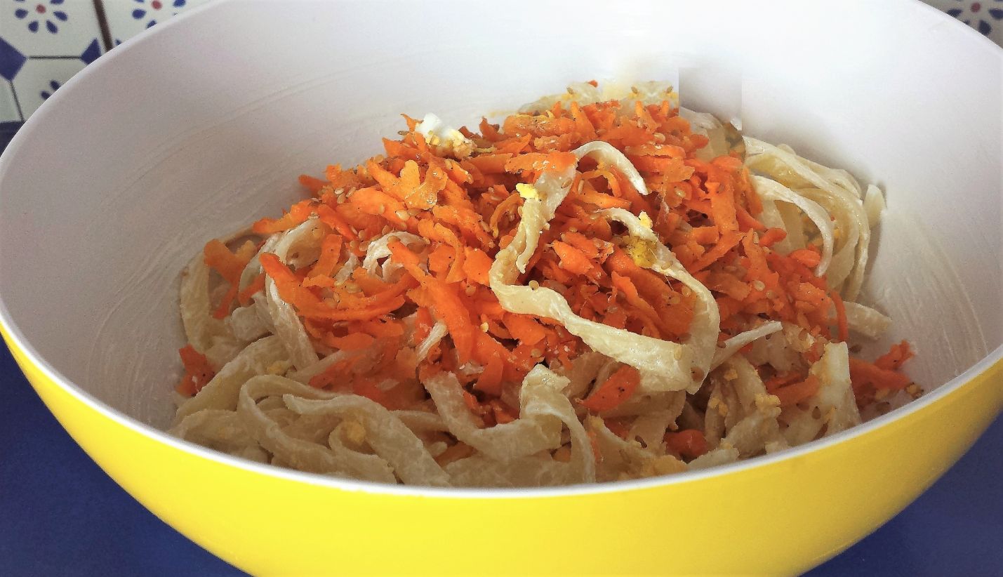 Grattugiate la carota (buchi grandi) e lo zenzero (buchi piccoli), fate tostare in padella il sesamo e poi unite e mescolate il tutto, aggiungendovi olio e sale. Nel frattempo fate bollire l’uovo sodo. ‘Sciogliete’ il caprino nella ciotola dove condirete la pasta, utilizzando un poco di acqua calda (può essere quella in cui sta bollendo l’uovo) e olio. Mescolate le tagliatelle e successivamente l’uovo sbriciolato (se è ancora caldo, va benissimo). Infine l’insalata di carote, ed eventualmente ulteriore olio.