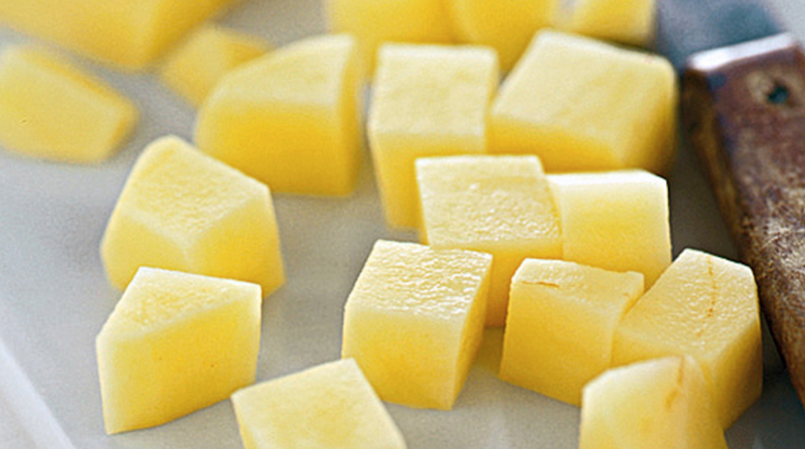 Per i classici cubetti da saltare in padella, si procede così: tenendo ferma una patata alle due estremità, tagliatela a fette dello spessore di circa 2 cm, sovrapponetele a due o tre per volta e tagliatele a bastoncini dello stesso spessore. Infine riunite i bastoncini girandoli nell'altro senso e riduceteli a cubetti.