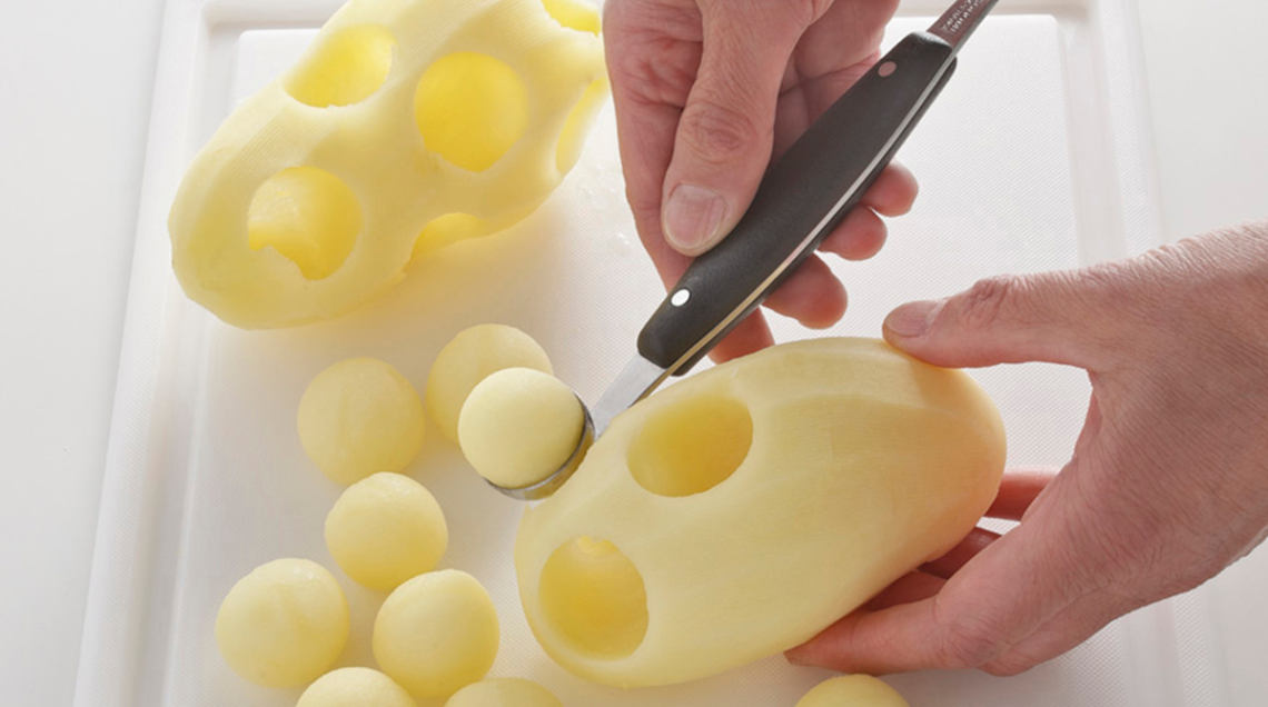 Per realizzare queste sfiziose palline da accompagnare all'arrosto, sbucciate le patate con un pelapatate in modo che la superficie sia il più possibile regolare, poi incidetele con movimento rotatorio usando uno scavino rotondo se volete delle palline od ovale se preferite la forma a olivetta.