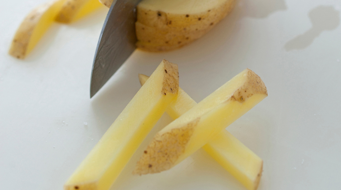 Tagliate per il lungo una grossa patata riducendola a fette di circa 1 cm di spessore, poi impilate 2-3 fette per volta e tagliatele nell'altro senso a strisce larghe sempre 1 cm. Per ottenere patate a fiammifero, usate la stessa tecnica riducendo le dimensioni a 2-3 mm.
