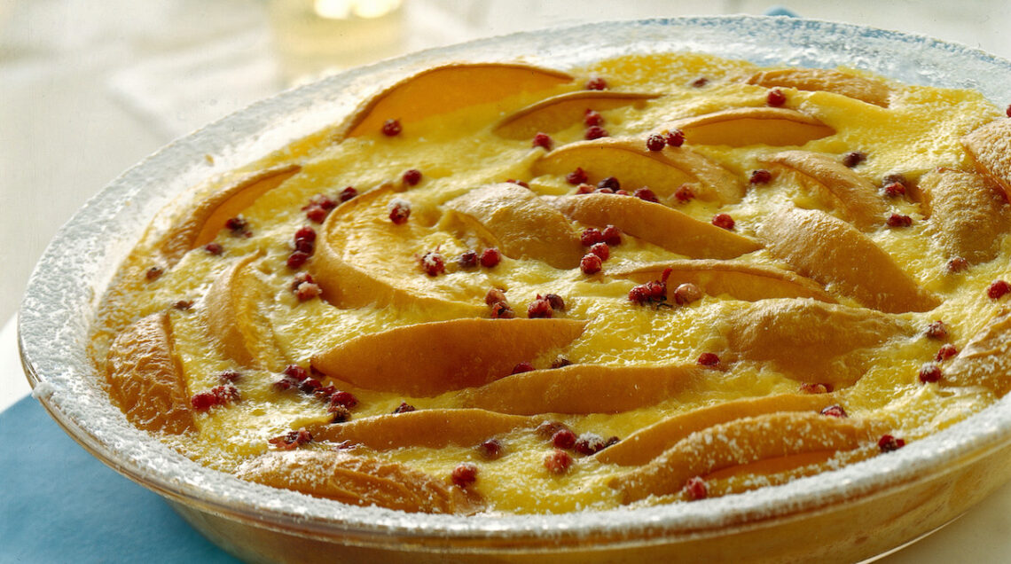 Clafoutis di percoche al pepe rosa. Con una frusta a mano, sbattete in una terrina 3 uova con 140 g di zucchero semolato e una bustina di vaniglina. Incorporate a filo 2 dl di panna fresca, un dl di latte e 20 g di burro fuso. Continuate a lavorare il composto fino a ottenere una pastella omogenea. Copritela e lasciatela riposare per qualche minuto. Intanto, lavate e tagliate a spicchi 600 g di percoche. Sistemate gli spicchi in una pirofila imburrata, versatevi sopra la crema preparata e cospargete sulla superficie un cucchiaino di pepe rosa in grani. Coprite con alluminio e cuocete in forno a 200° per circa 30 minuti. Eliminate l’alluminio, spolverizzate la superficie del clafoutis con abbondante zucchero a velo e continuate la cottura in forno per altri 10-15 minuti. Servite il dolce tiepido. Per 6 persone.