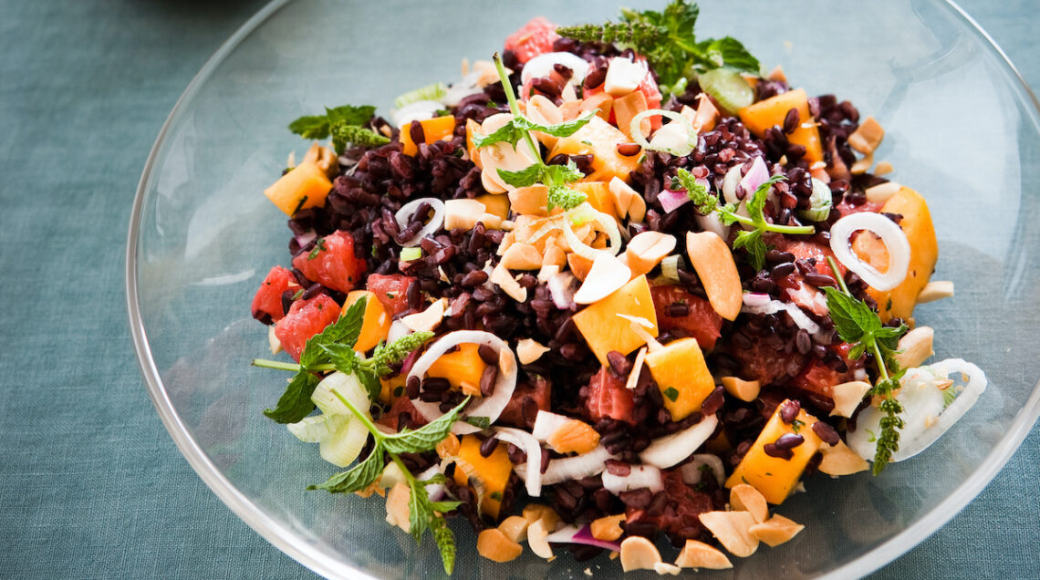 Riso nero con condimento agrodolce. Lessate 200 g di riso Venere in acqua bollente salata, scolatelo, fermate la cottura sotto l’acqua corrente, allargatelo su un vassoio e lasciatelo raffreddare. Tagliate a dadini 2 percoche e la polpa di 2 pompelmi rosa, pelati al vivo. Mescolate la frutta in una terrina, salate e pepate. Affettate a rondelle 4 cipollotti rossi, metteteli in una ciotola, salateli e spruzzateli con succo di lime o limone. Tostate in una padella antiaderente una manciatina di arachidi sgusciate, salatele e tritatele grossolanamente. Mescolate il riso con la frutta, i cipollotti, le arachidi e qualche foglia di menta e basilico tritata. Condite con un giro d’olio, regolate di sale e pepate. Lasciate riposare al fresco per circa un’ora prima di servire. Per 4 persone.