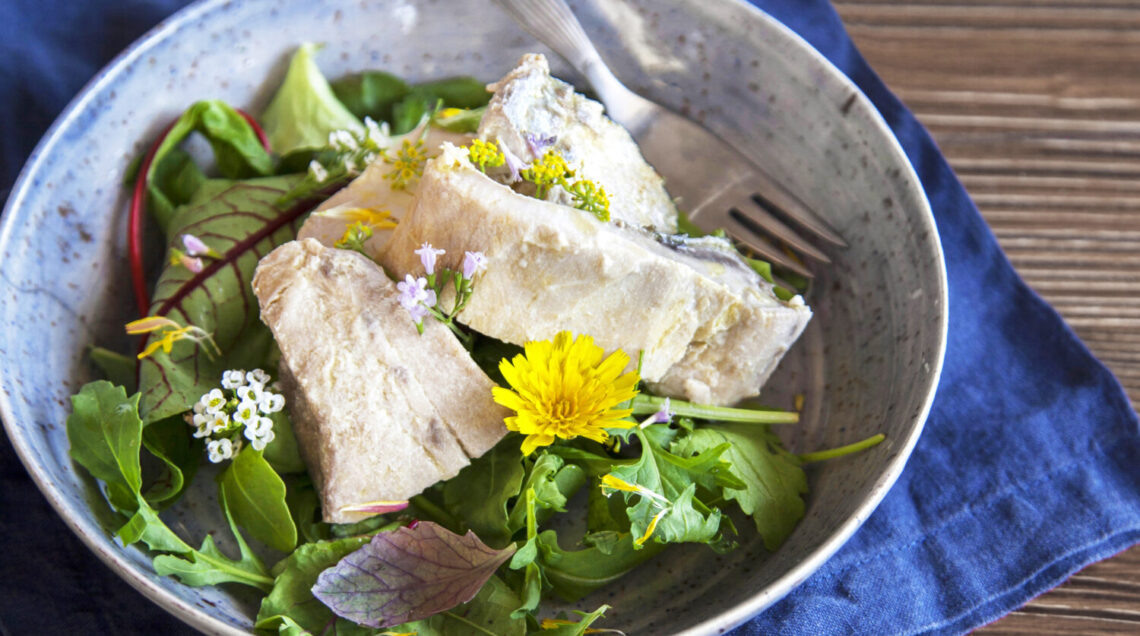 Un pesce azzurro dal sapore deciso, lessato in acqua aromatizzata con aceto ed erbe aromatiche. Una manciata di misticanza e qualche fiore per guarnire e il piatto è servito