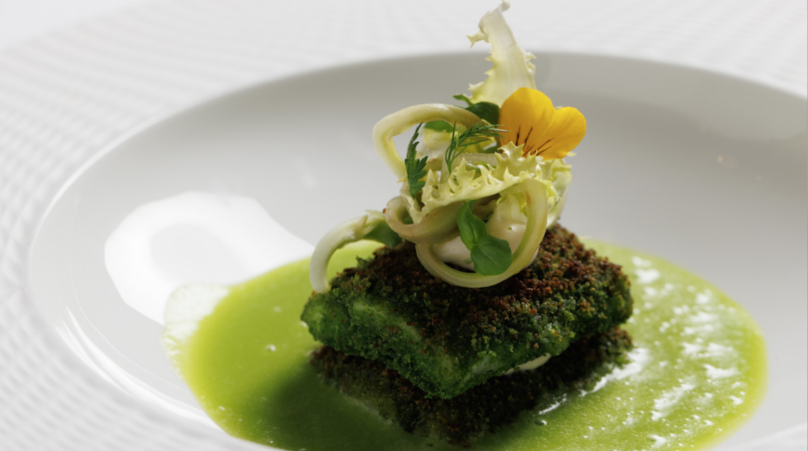 Un primo piatto gourmand, preparato con un pesce pregiato esaltato dalla salsa di olive, la crema di finocchi, la crema di mandorle e una croccante panatura mediterranea