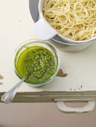 Di zucchine e noci (nella foto in alto, il vasetto a sinistra). Sciacquate 160 g di zucchine novelle e spuntatele. Grattugiatele con una grattugia a fori grossi, raccoglietele in un grosso colino, cospargetele con un pizzico di sale e lasciatele scolare per una ventina di minuti, poi strizzatele con cura. Trasferite le zucchine nel mixer con 50 g di gherigli di noce e 15 g di erba cipollina tagliuzzata. Frullate a intermittenza unendo circa 50 ml di olio extravergine d’oliva, fino a ottenere un pesto non troppo liscio. Pepate a piacere.