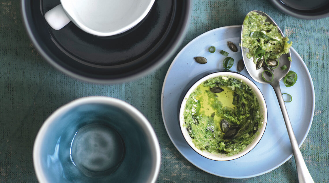 Pesto di zucchine crude, olive e feta (nella foto di apertura). Grattugiate 500 g di zucchine novelle, conditele con il succo di un limone, un pizzico di sale, una macinata di pepe e lasciate riposare in un colino per 10-15 minuti in modo che perdano l’acqua di vegetazione. Mettetele nel mixer con la parte verde di un cipollotto tagliata a rondelle, 80 g di olive verdi snocciolate, 60 g di semi di zucca e poco sale. Azionate per pochi istanti, aggiungendo 3 cucchiai di olio extravergine d’oliva. Infine, mescolate il composto in una terrina con 120 g di feta sbriciolata. Pepate a piacere.