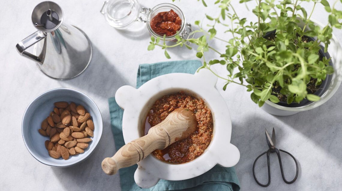 Il pesto alla genovese, si sa, prende il nome proprio dall’utensile utilizzato per la sua realizzazione: il pestello che, fatto ruotare all’interno del mortaio (rigorosamente di marmo!), tritura, macina e amalgama basilico, aglio, pinoli, pecorino e olio extravergine d’oliva. La stessa tecnica si può usare per i pesti “diversi” (nella foto in alto, di pomodori secchi, mandorle e maggiorana). Tuttavia, nella cucina di tutti i giorni il mortaio cede spesso il passo al frullatore, a bicchiere o a immersione: una “licenza” che i liguri non ammettono ma, per praticità, è largamente adottata. Un piccolo trucco, per evitare l’ossidazione (e quindi l’annerimento) delle erbe aromatiche, è quello di tenere il recipiente del frullatore in freezer: così, si stempererà il calore prodotto dalle lame durante la lavorazione, che comunque deve essere il più rapida possibile. Alcuni pesti, infine, si avvantaggiano di una consistenza grossolana che si ottiene lavorando al coltello.
