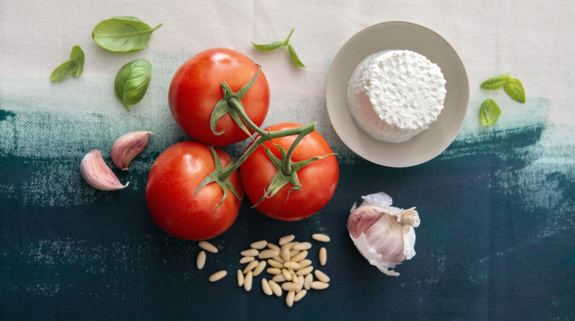 Pesto alla siciliana. Lavate e asciugate 500 g di pomodori, divideteli in quarti e privateli dei semi. Lavate e asciugate 20 g di foglie di basilico. Trasferite tutto in un mixer con 100 g di grana grattugiato, 30 g di pinoli, 100 g di ricotta vaccina, mezzo spicchio d’aglio, sale e pepe. Frullate gli ingredienti unendo a filo 0,5 dl circa di olio extravergine d’oliva, fino a ottenere un pesto liscio e omogeneo. Se necessario, regolate di sale e pepate.