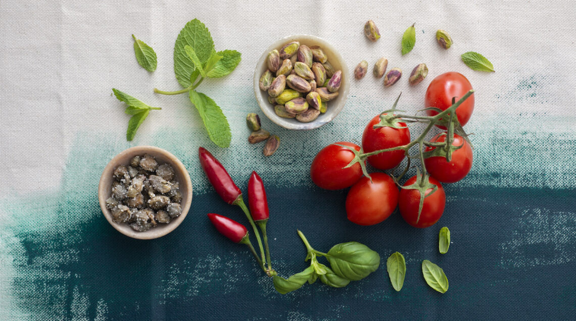 Pesto eoliano. Lavate e asciugate 20 g di foglie di basilico e 10 g di foglie di menta. Dissalate in acqua tiepida un cucchiaio di capperi sotto sale. Lavate e asciugate 300 g di pomodorini, tagliateli in quarti e privateli dei semi. Sbucciate uno spicchio d’aglio. Trasferite tutto in un mixer con un peperoncino fresco, 30 g di pistacchi sgusciati e spellati e frullate gli ingredienti unendo a filo circa un dl di olio extravergine d’oliva fino a ottenere un pesto omogeneo. Salate solo se necessario.