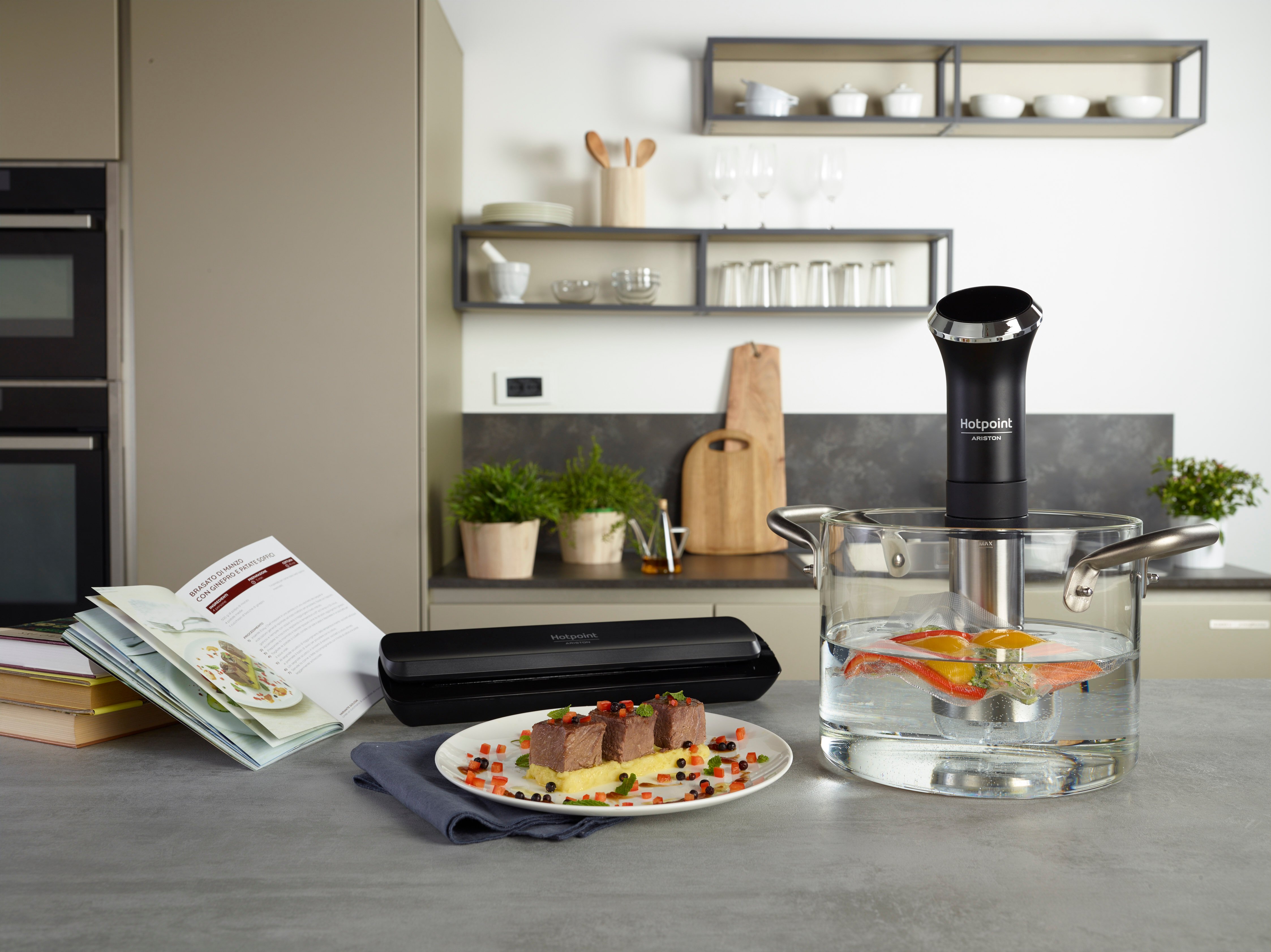 Il primo della linea di piccoli elettrodomestici GoHealthy!, creata da Hotpoint per coniugare gusto e benessere, è Easy Chef Sous Vide, per cucinare a casa con la tecnica del sottovuoto, come fanno i grandi chef stellati, mantenendo tutti i nutrienti e il gusto autentico del cibo. La cottura avviene a bassa temperatura e i cibi cuociono nei loro succhi. Prezzo: 249, 90 euro.