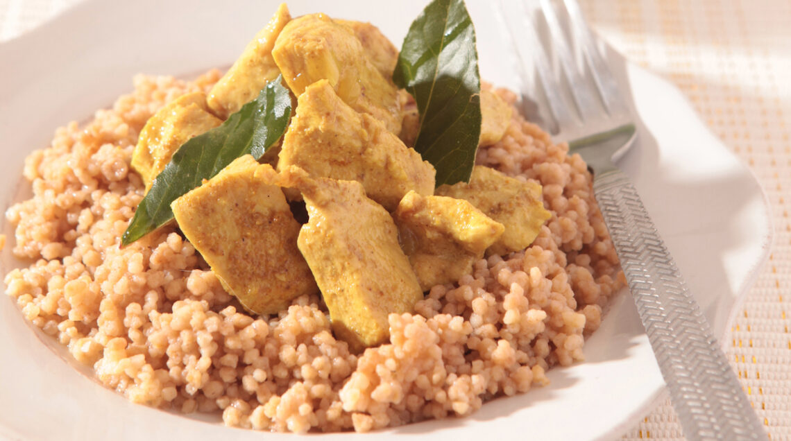 La ricca salsa “chiama” un accompagnamento capace di assorbirla. Oltre alle patate, un grande classico è il riso bianco, semplicemente lessato o tutt’al più condito con uni filo d’olio o una piccola noce di burro. Guardate la nostra videoricetta in cui abbiamo abbinato un Basmati, gradevolmente profumato. Spostandoci dall’India al Medioriente, regione in cui comunque la miscela di spezie è diffusa, possiamo abbinare il pollo al curry al cous cous (foto in alto) oppure sperimentare il bulgur (grano spezzato) e persino la nostra fregola sarda: tutti granelli che raccoglieranno bene il sughetto, rendendo il pollo al curry un irresistibile piatto unico.