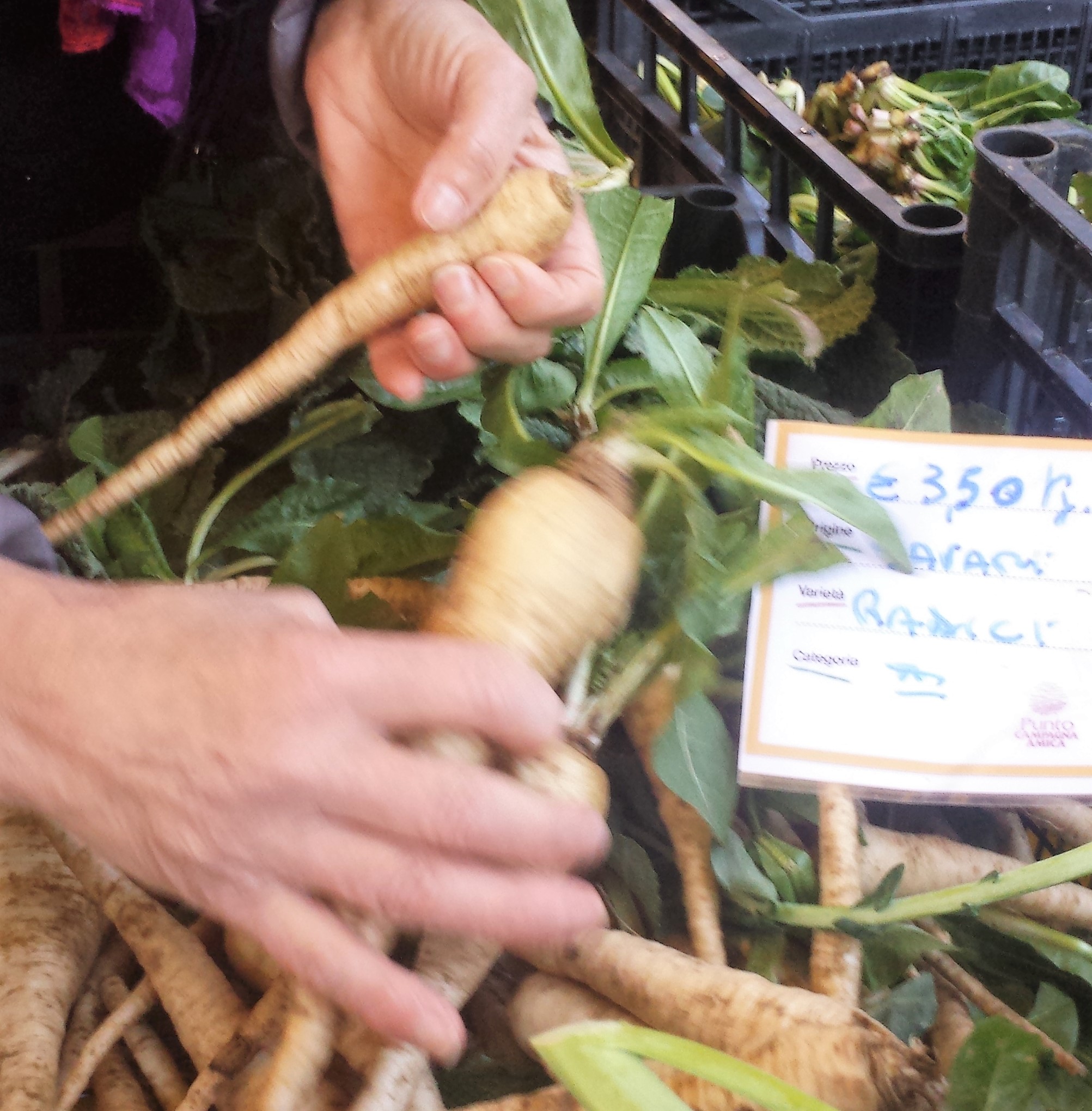 Per quanto riguarda la conservazione, è bene metterle in un sacchetto di plastica in frigo per conservare l’umidità. Ma attenzione, c’è una grande differenza tra le radici bianche amare tuberformi e quelle “a grissino” (come quella di Soncino). Mentre le prime non darebbero impulso a una nuova pianta, e dunque col passare dei giorni appassiscono, si afflosciano, le seconde sono ‘vive’ e continuano a ‘lavorare’: il ciuffetto verde cresce e fiorisce, la radice può buttare altre radicette mentre lei diventa sempre più dura, legnosa. Nel giro di una settimana avrà la consistenza di un osso! Infatti ‘i vecchi’ ai tempi in cui non si buttava davvero via nulla, quando anche erano già dure spesso le facevano bollire a lunghissimo per poi scalpellar via la parte oramai inutilizzabile. Conclusione: mangiarle il prima possibile! Ancora qualche idea sul come? Vellutate, abbinandole e mescolandole con le nostrane, amabili patate. O crocchette (magari insieme a legumi e sapori).