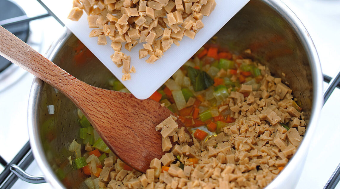C’è, naturalmente, anche la possibilità di usare i prodotti tipici della cucina vegana come il seitan (nella foto in alto), la soia disidratata in fiocchi o in granulato e anche i “macinati” plant based, proposti dalle stesse aziende che, negli ultimi anni, offrono burger, polpette e bocconcini “cruelty free”.