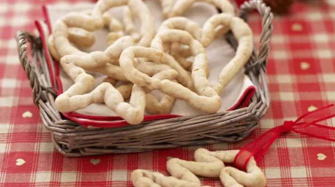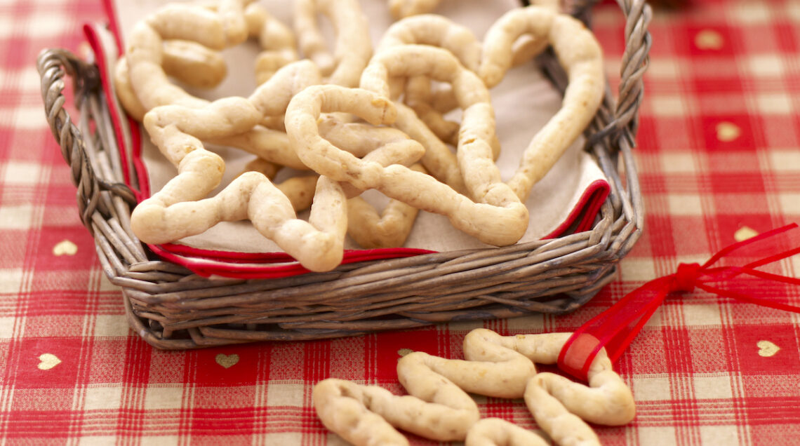 Dal dolce al salato, ma sempre croccante! Per realizzare questi fragranti grissini, sciogliete 8 g di lievito di birra in 1,6 dl di acqua tiepida e unite un cucchiaio di olio. Impastate 300 g di farina con questa miscela. Lasciate riposare per 10 minuti. Salate e lavorate altri 10 minuti sul piano infarinato. Formate una palla, mettetela in una ciotola, coprite con un telo umido e fate lievitare un’ora. Incorporate 30 g di gherigli di noce tritati. Staccate un pezzetto di impasto alla volta e rotolatelo sul piano infarinato per ottenere grissini attorcigliati spessi un dito con cui creare forme a cuore, albero o stella. Man mano che sono pronti disponeteli su teglia coperta di carta da forno e cuoceteli 20 minuti a 180°. Confezionateli in un sacchetto di cellophane per alimenti e abbinateli a una bottiglia di vino bianco floreale e fruttato, come un Trebbiano d’Abruzzo, o a un Cabernet Sauvignon, rosso intenso che ricorda i profumi del bosco.