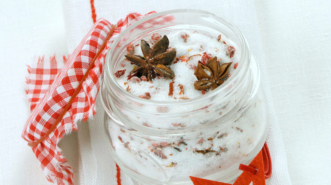Ecco il regalo perfetto per chi ama cucinare con aromi e tocchi esotici. Mescolate in una ciotola 250 g di sale in fiocchi (Maldon o fleur de sel) con 2 cucchiaini di peperoncino in fiocchi, 2 cucchiaini di pepe rosa e 5 anici stellati. Trasferite il sale in un vasetto di vetro, prima sterilizzato (come si fa per i barattoli delle conserve) e asciugato benissimo. Fate riposare qualche giorno prima di confezionare e regalare il sale, dedicato agli amanti di bistecche, pollo arrosto, pesce al forno. Si conserva un anno.