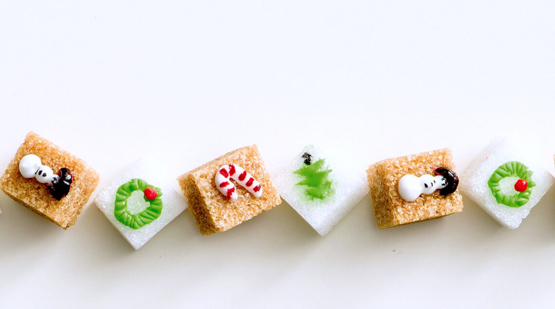 Ecco un’idea per decorare le zollette di zucchero bianco o di canna, magari da abbinare al tè di Natale. Mescolate in una ciotola 200 g di zucchero a velo e un albume. Unite 3-4 gocce di succo di limone e amalgamate. Dividete la glassa in più ciotoline e tingete ogni parte con qualche goccia colorante per alimenti a piacere. Trasferite le glasse in grosse siringhe senza ago, aspirandole direttamente dalle ciotoline, e decorate le zollette. Lasciate asciugare, poi allineate le zollette in una scatola, se possibile con il coperchio trasparente, o incartatele singolarmente in pezzetti di cellophane per alimenti o carta da forno, come fossero caramelle. Fare le glasse vi sembra difficile? Usate quelle pronte in tubetto!