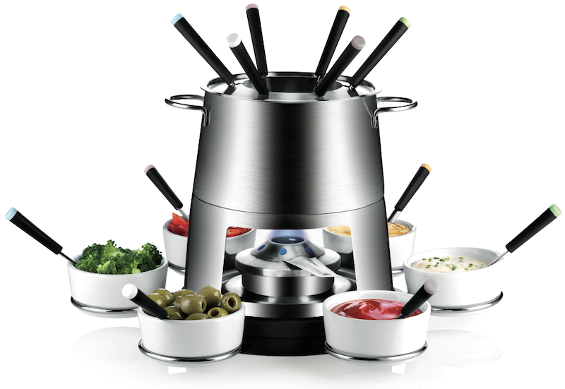 Indispensabile è avere gli strumenti giusti: il set per fondue della linea Siesta di Tescoma è dotato di due tipi di contenitore, uno in acciaio inossidabile per la carne e uno in ceramica per formaggio o cioccolato, di sei ciotole girevoli, sei forchette e sei cucchiai con manici in colori diversi… per non confondersi! Prezzo consigliato 99 euro. Per info in più e acquisti, clicca qui.