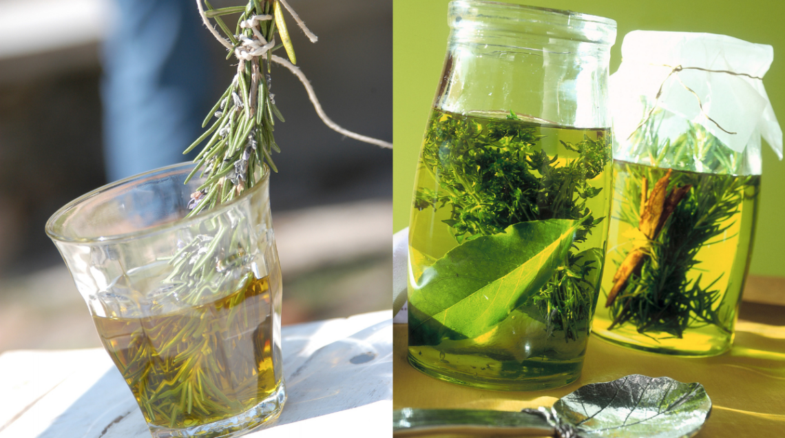 È possibile coltivarlo sul terrazzo, come raccontiamo qui, oppure mettere i rami in un vaso o un bicchiere, a seconda della loro altezza, con semplice acqua, così si conservano per alcuni giorni, pronti all’uso. Per essiccarlo essiccarlo, basta infilare i rametti interi in un barattolo di vetro a chiusura ermetica oppure, una volta disidratato, preferibilmente all’aria e all’aperto, si può tritare finemente, a mano o con un frullatore, e riporlo in vaso. Il rosmarino è buono anche sott’olio, impiego che ha un doppio scopo: si conserva a lungo e nello stesso tempo profuma l’olio (foto sopra), da usare per cucinare o per condire insalate. Si usa solo rosmarino o si può mescolare con altre erbe aromatiche, spezie, aglio; è da preferire un olio dal sapore delicato che non copra quello dell’erba aromatica ed è fondamentale il riposo di almeno 20 giorni prima dell’uso. Se cercate qualcosa di più sfizioso, il pesto di rosmarino diventa un jolly in cucina: per ottenerlo, frullate, o pestate in un mortaio, rosmarino, aglio, noci o pinoli, poco formaggio, olio; se il sapore della salsa rimane troppo deciso, si può aggiungere un po’ di prezzemolo. Il pesto di rosmarino è ideale, per esempio, con le focaccette di patate. Se, invece, cercate una ricetta più golosa, la crema di burro e miele di castagno con timo, rosmarino e cannella è irresistibile spalmata sul pane.