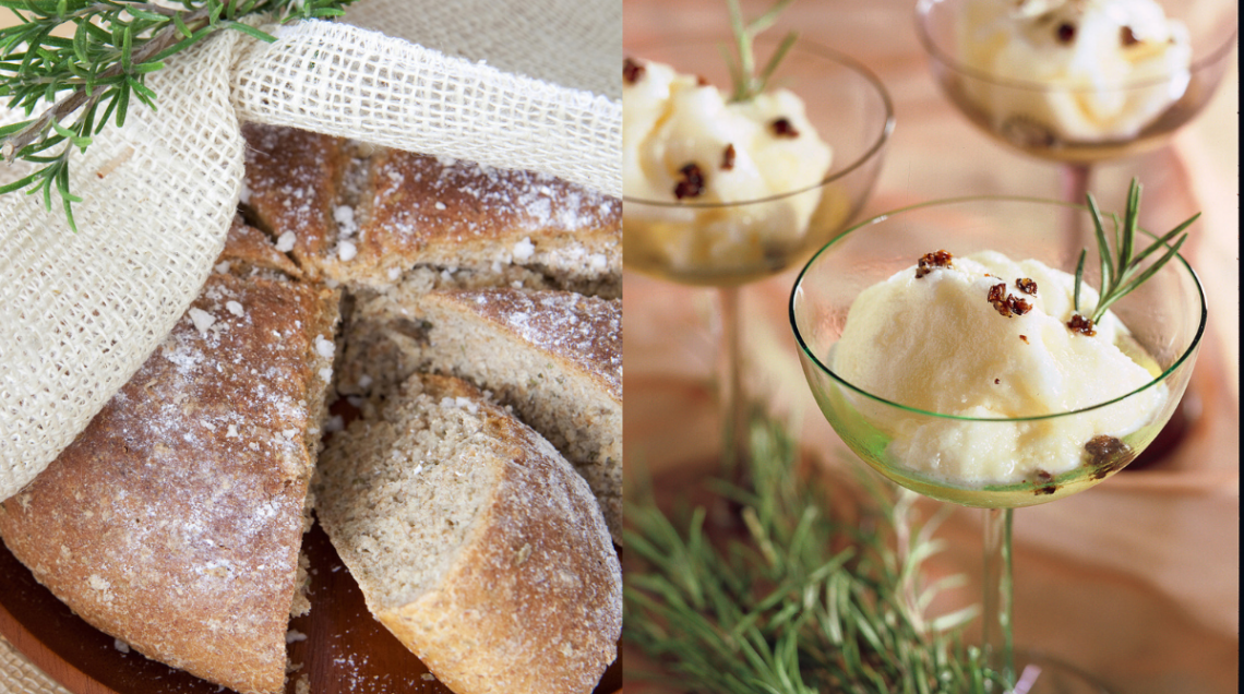 I ciuffi di rosmarino sono usati per insaporire molti piatti dai primi (zuppe, pasta, risotti, come il Carnaroli limone, rosmarino e vaniglia, pasta ripiena, ravioli, lasagne e cannelloni) a quelli a base di carne (coppa arrosto al vino e rosmarino) e pesce (salmone farcito ai limoni, clementine e rosmarino); è impiegato in quasi tutti i tipi di cotture, in padella, al forno, al vapore e al cartoccio. Ne bastano un paio di ciuffi per profumare l’olio di frittura (magari aggiungendo anche uno spicchio di aglio), le conserve di verdure e di frutta (da provare nella confettura di albicocche, di pesche e di limoni), le insalate. Un aroma che si sposa con il pane (foto sopra a sinistra), si presta alla preparazione del pesto (da provare la costata con pesto di lardo e rosmarino) e completa il bouquet di certi dolci, come il sorbetto (foto sopra a destra), la focaccia al rosmarino, fragole e pinoli e la crema di mandorla e pistacchio con more al rosmarino, fino alla granita di pesche, rosmarino e pistacchi e al gin tonic.
