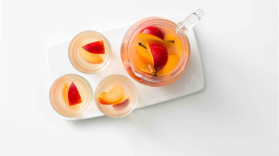 Fresca versione della nota bevanda spagnola, la sangria bianca è ideale per un aperitivo estivo: ricca di frutta è preparata con vino bianco, brandy e Martini